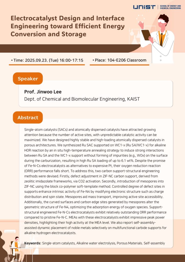[2025-2 Seminar] Electrocatalyst Design and Interface Engineering Toward Efficient Energy Conversion and Storage 2025.08.28 Division Seminar Date 2025-09-23 16:00 Venue 104-E206 Speaker Prof. Jinwoo Lee (KAIST)
